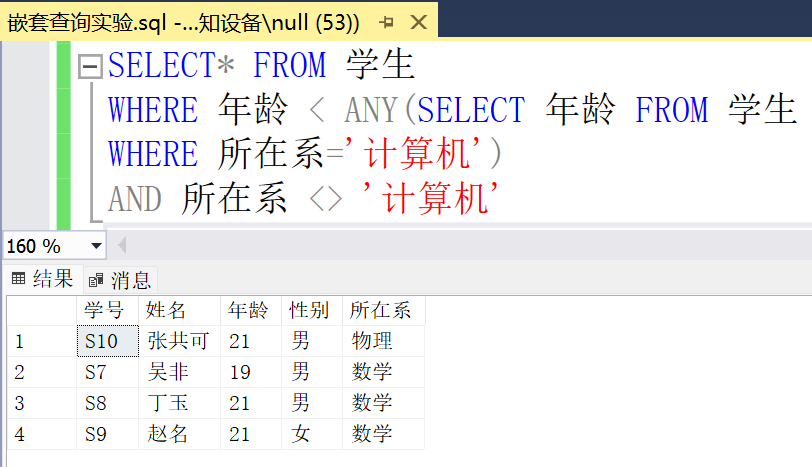 (3)求其他系中比计算机系某一学生年龄小的学生。