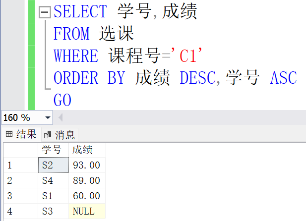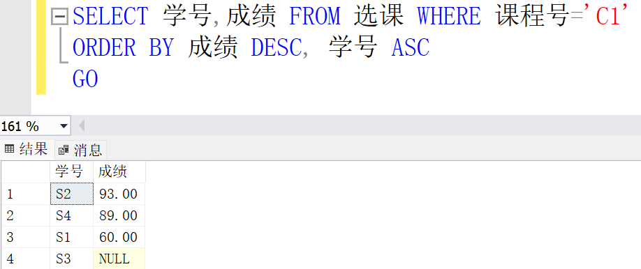 求选修C1课程的学生学号和成绩,并要求对查询结果按成绩的降序排列,如果成绩相同则按学号的升序排列。