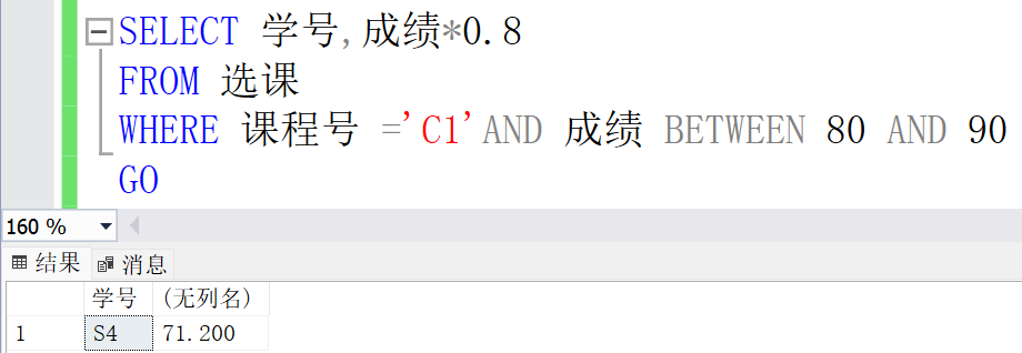 求选修课程C1且成绩在80-90之间的学生学号和成续,将成绩乘以系数0.8输出。