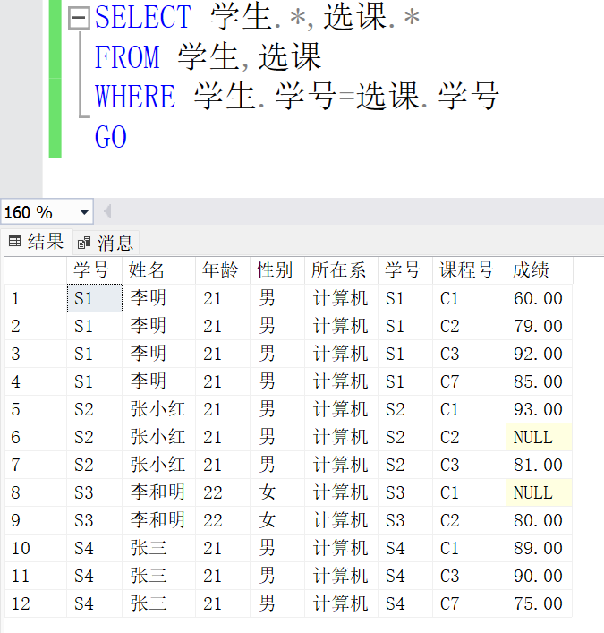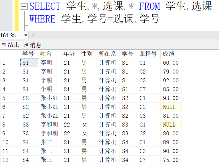 (2)连接查询操作。该实验包括等值连接、自然连接、求笛卡儿积、一般连接、外连接、内连接、左连接、右连接和自连接等。