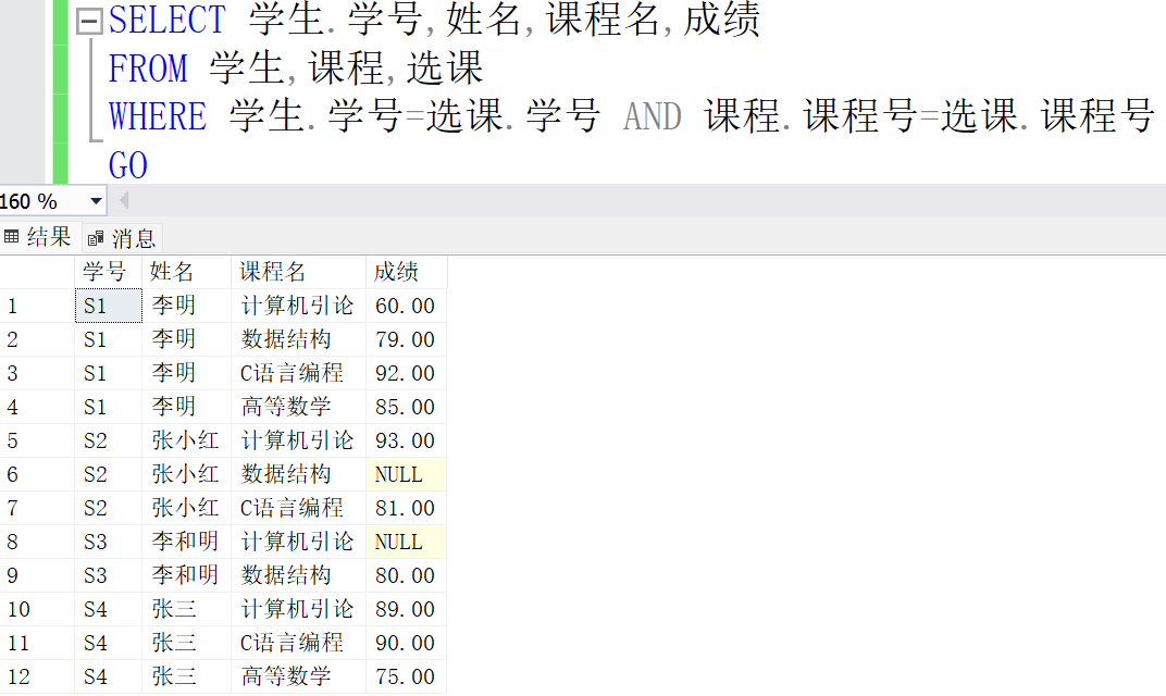 检查并修改学生课程库的效据,使之与表10-11至表10-13的数据一致;将下列查询要求用T-SQL语句表示;在SSMS的查询分析器中输人相应的T-SQL语句,执行并在结果区中查看内容;结果不正确时要对T-SQL语句修改,直到正确为止。