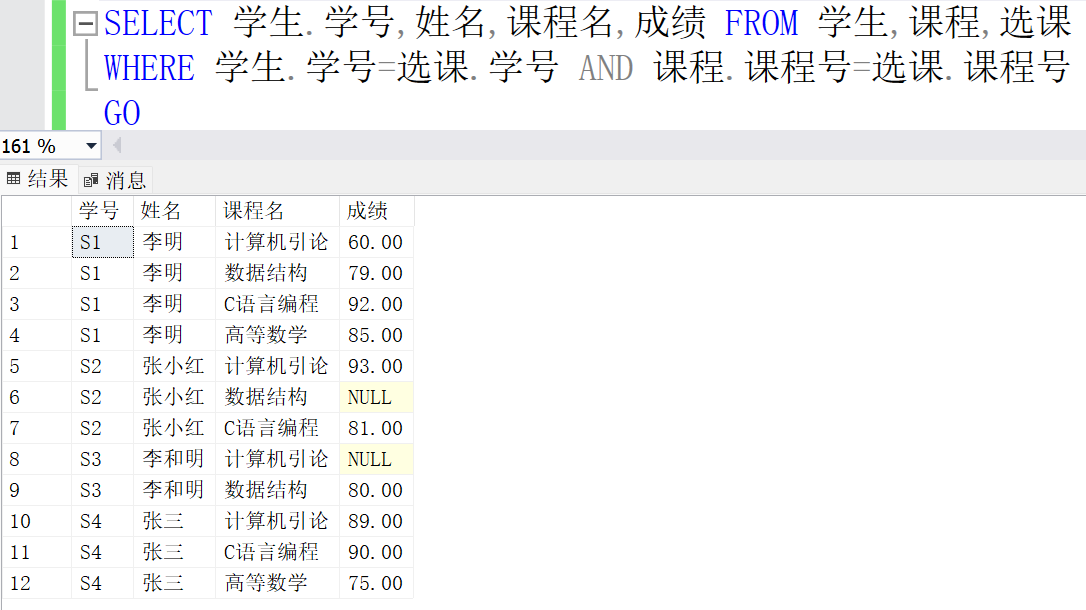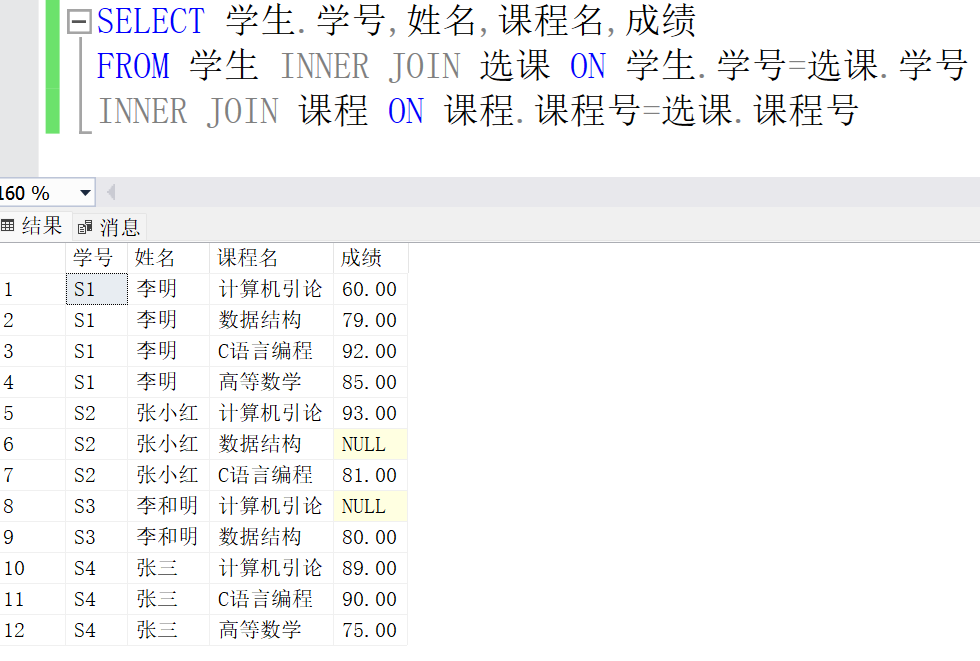 检查并修改学生课程库的数据,便之与表10-11至表10-13的数据一致;