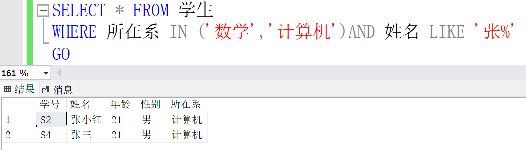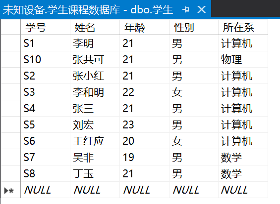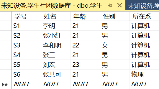 1 | INSERT INTO 学生(学号,姓名,年龄,性别,所在系) VALUES('S1','李明',21,'男','计算机') |