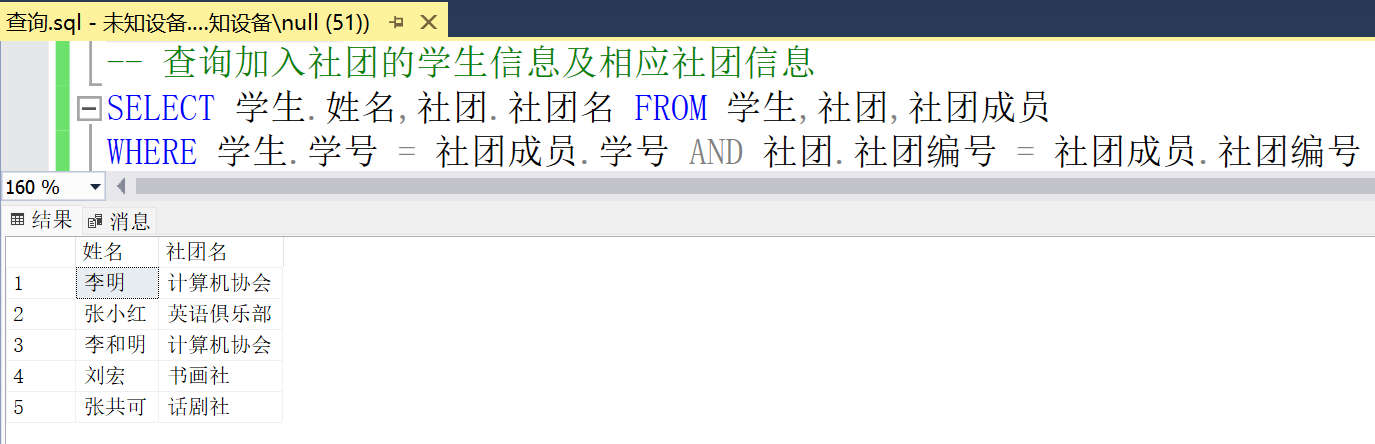 1 | -- 查询2. 查询已加入社团的学生及其社团信息 |