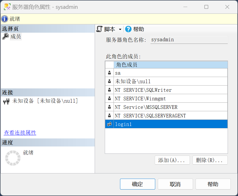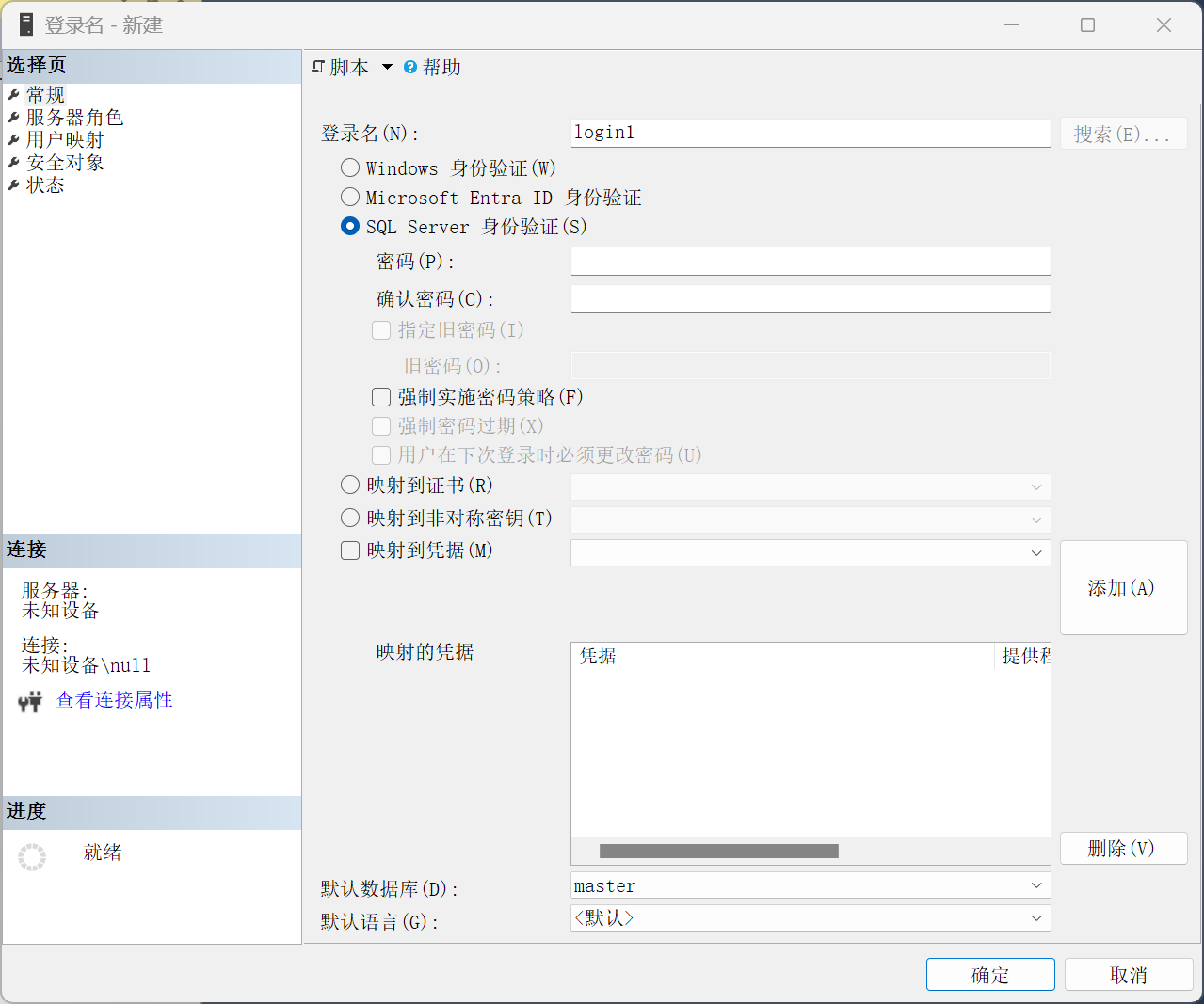 I)为正在使用的SQL服务建立新登录名(名为”login1”),使用SQL Server身份验证。