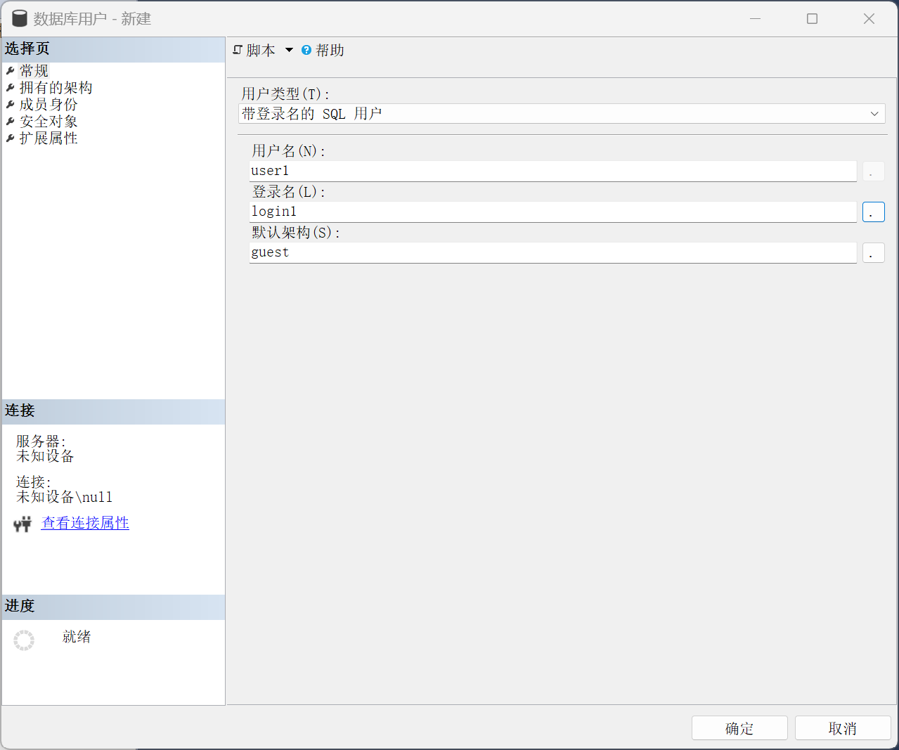 II)在学生课程库中,新建数据库用户名为”user1”(登名为”login1”),新建学生课程数据库角色名为”rose1”。