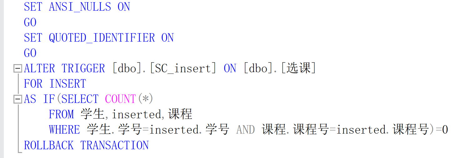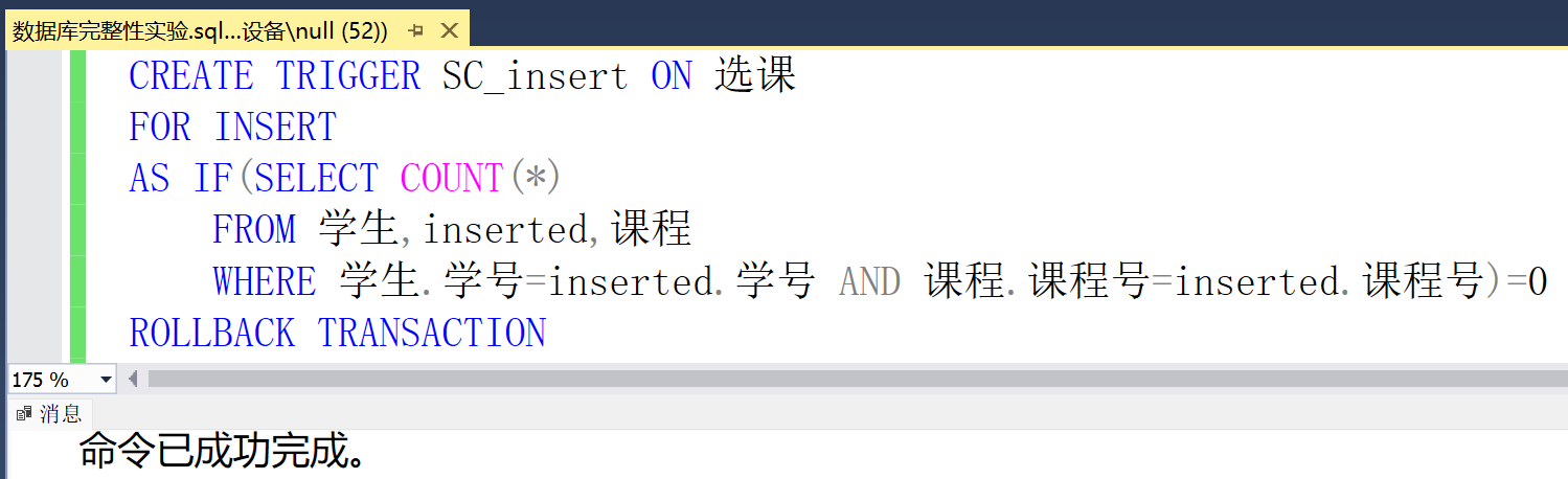 建立学生选课库中选课表的插入数据型触发器,保证学生选课库中选课表的参照完整性,以维护其外码与参照表中的主码一致。该实验的T-SQL参考代码如下。
