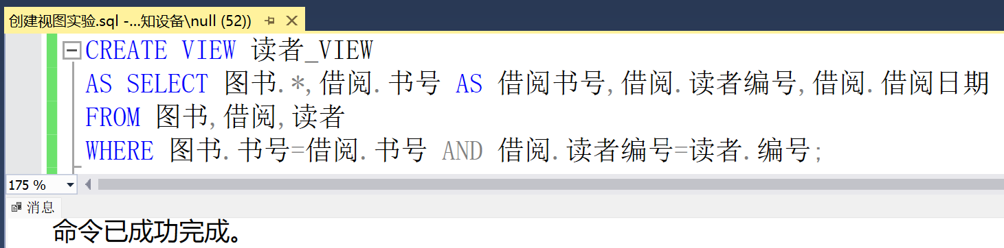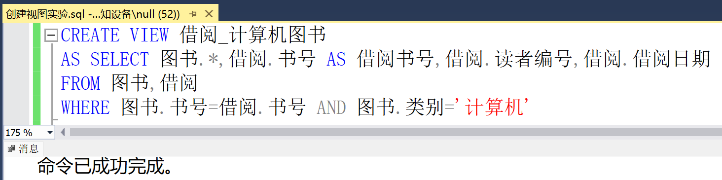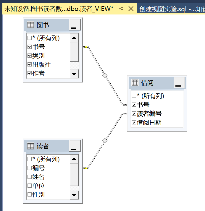 (2) 在SQL Server Management Studio 中,选中图书读者数据库下的视图对象,调出创建视图工具,按下列Transact-SQL描述的视图定义,创建借阅_计算机图书视图
