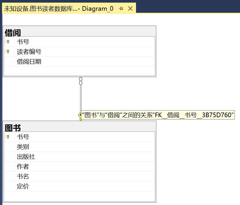 在SQL Server Management Studio中,选中图书_读者数据库下的数据库关系图对象,调出创建关系图工具,完成在图书_读者数据库中建立一个图书_借阅关系图操作。要求该关系图包括图书和借阅两个表,并符合表达式“图书.书号=借阅.书号”的外码约束。