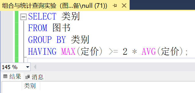 1)查找图书类别,要求类别中最高图书定价不低于全部按类别分组的平均定价的2倍。