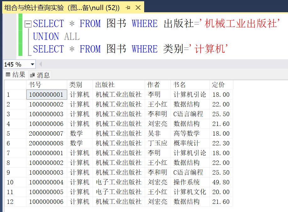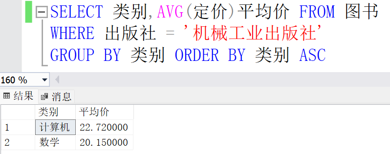 2)求机械工业出版社出版的各类图书的平均定价,用GROUP BY表示。